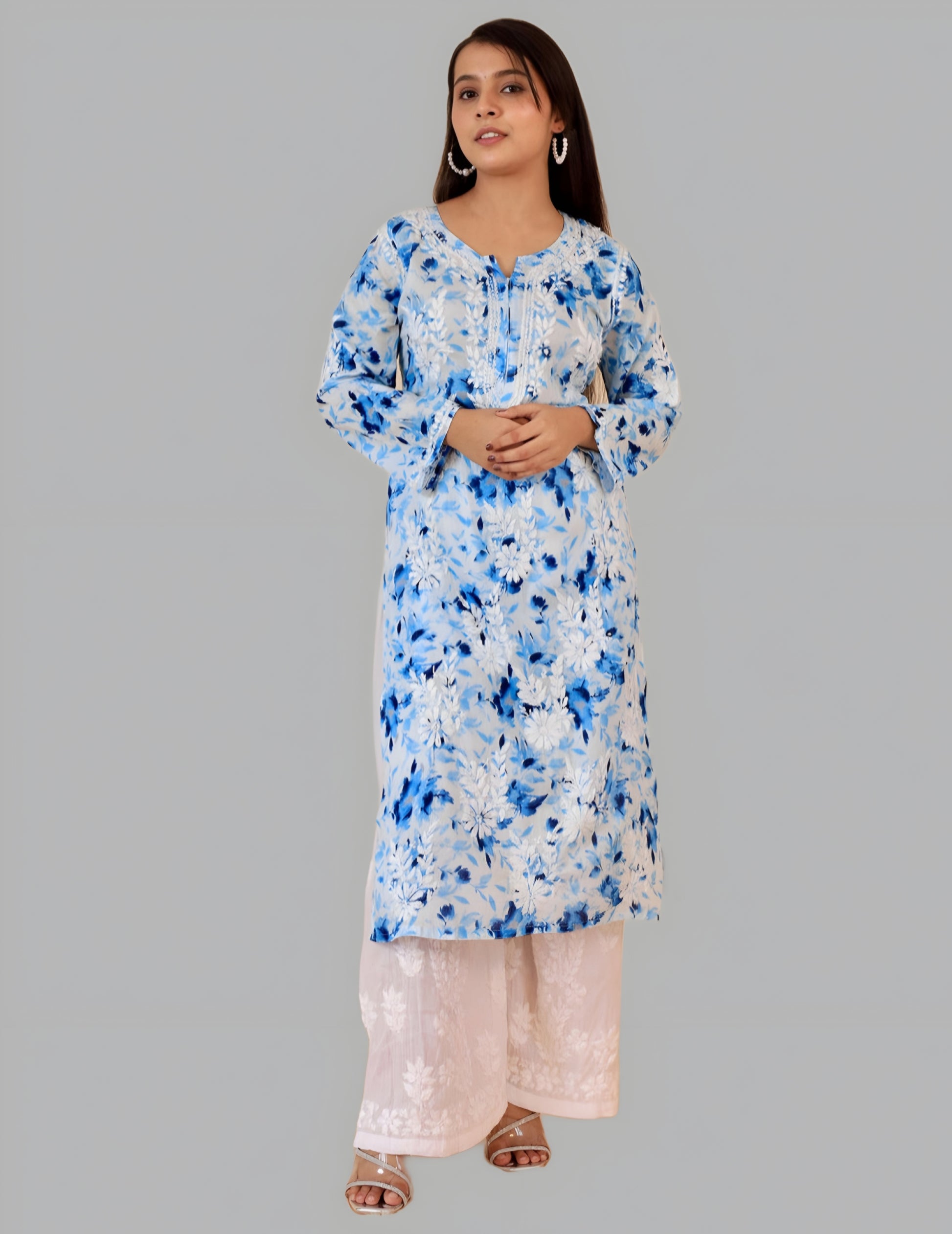 The delicate floral print on a pristine white base enhances its feminine appeal, making it a versatile addition to your wardrobe. Hand-embroidered Chikankari stitches, intricately crafted by skilled artisans, add a touch of elegance and tradition to this contemporary outfit. The straight long kurti silhouette ensures a flattering fit for all body types, making it suitable for casual wear, festive occasions, office wear, and college outings.